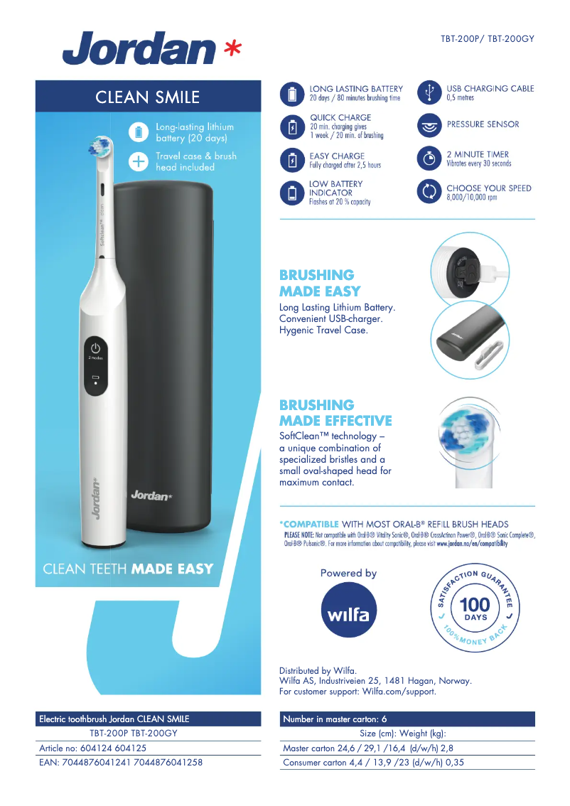 Fiche technique : Wilfa Jordan Clean Smile TBT-200P brosse à dents